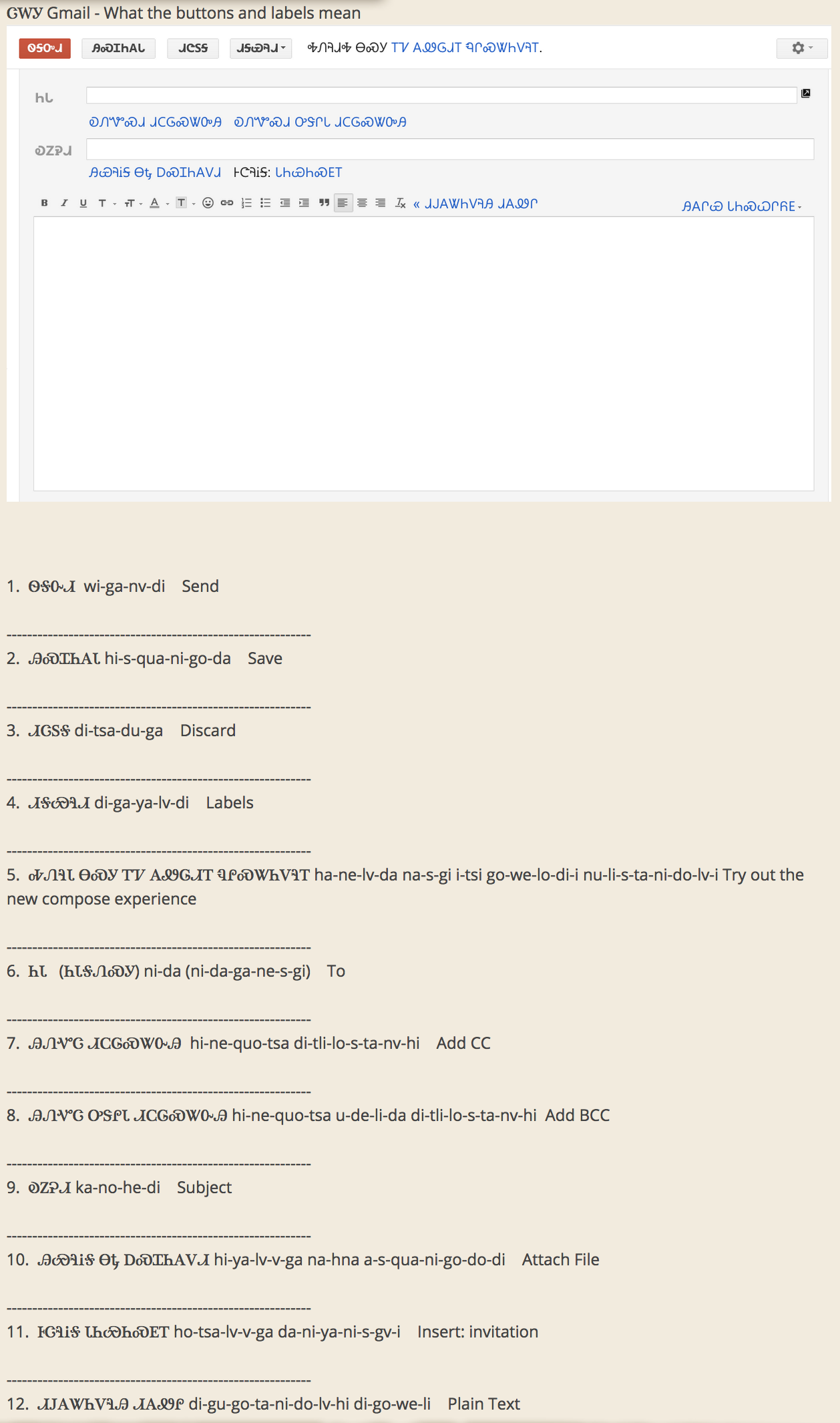 In 2012, Cherokee Nation finished translating Google’s Gmail and it became the first email service to be translated into a Native American language. Below are instructions and a screenshot of a new message with the translated terms.