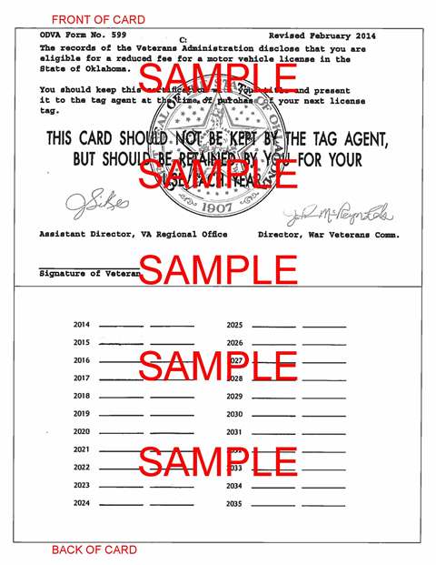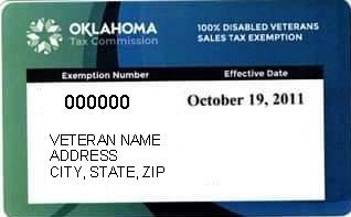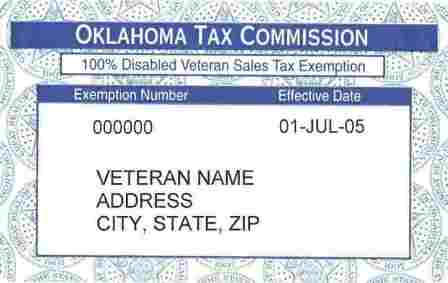 Any vehicle purchased by a Cherokee Nation Citizen who has been honorably discharged from active service in any branch or Armed Forces of the United States or the Oklahoma National Guard and who has been certified by the United States Department of Veterans Affairs, its successor, or the Armed Forces of the United States to be a disabled veteran in receipt of compensation at the one-hundred percent (100%) rate for a permanent disability sustained through military action or accident resulting from disease contracted while in such service shall be exempt from registration tax. The exemption may be claimed on only one (1) vehicle in a consecutive three (3) year period by any single qualifying veteran. The exemption applies to motor vehicle only. Boat/Motors do not apply. The exemption does not apply to surviving spouses of qualified veterans. The qualifying veteran must be listed on the title as an owner of the vehicle. The vehicle must have been purchased on or after June 19, 2006. The Veteran must present their Sales Tax Exemption Card.